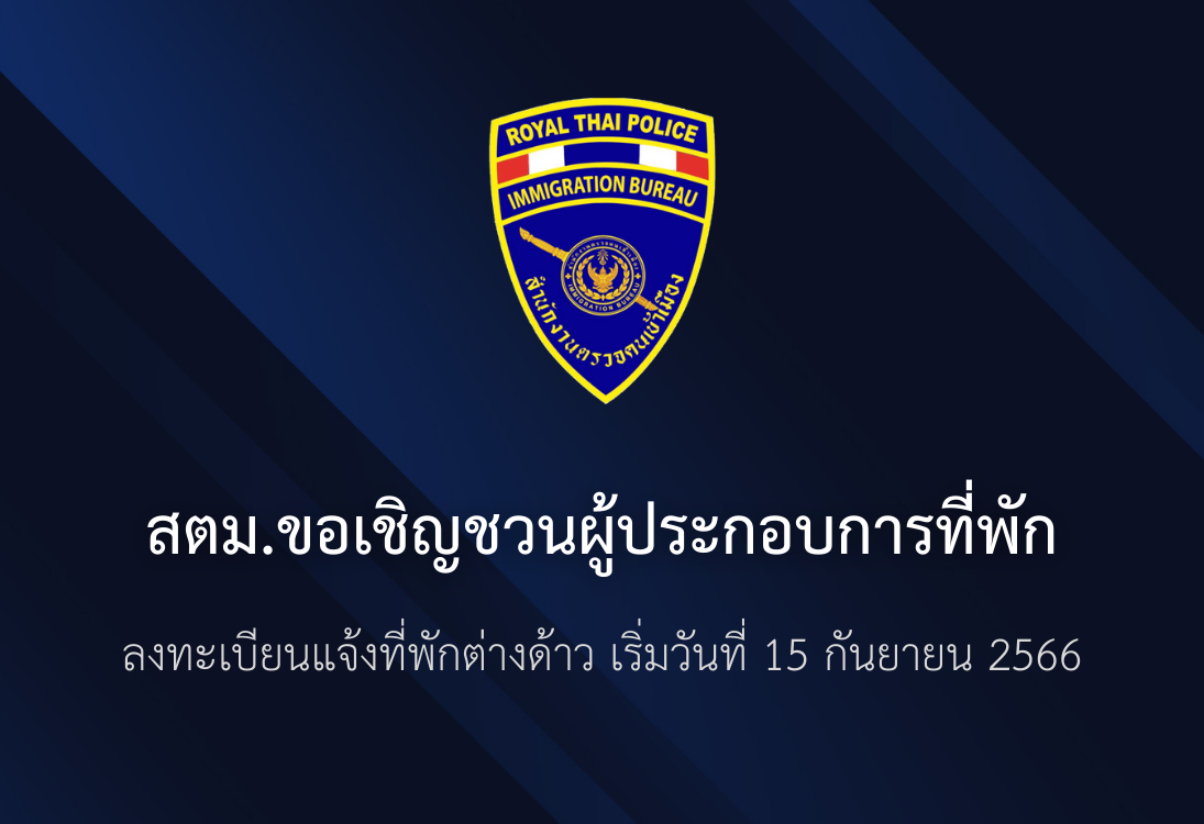 - ระบบแจ้งที่พักระบบใหม่ของ สตม. เพื่อทดแทนแก้ไขปัญหาระบบแจ้งที่พักเดิม ประชาสัมพันธ์เจ้าบ้านในระบบอีเมลล์แล้ว