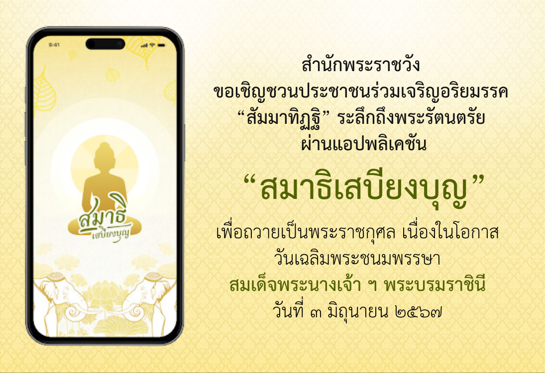สำนักพระราชวัง ขอเชิญชวนประชาชนร่วมเจริญอริยมรรค “สัมมาทิฏฐิ” ระลึกถึงพระรัตนตรัย ว่าเป็นสรณะที่พึ่งที่ยึดถือ อันเป็นทางเป็นธรรมที่พระพุทธองค์ได้ทรงตรัสไว้โดยชอบ ผ่านแอปพลิเคชัน “สมาธิเสบียงบุญ” ระหว่างวันที่ 1 – 7 มิถุนายน 2567