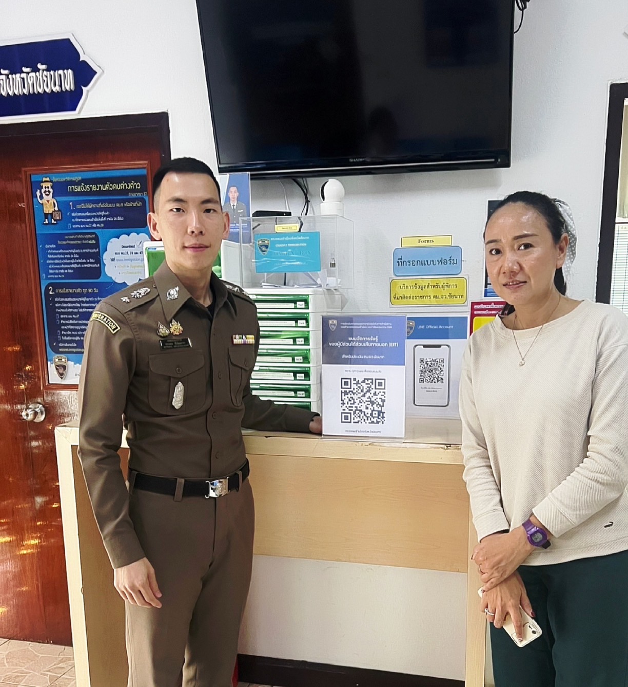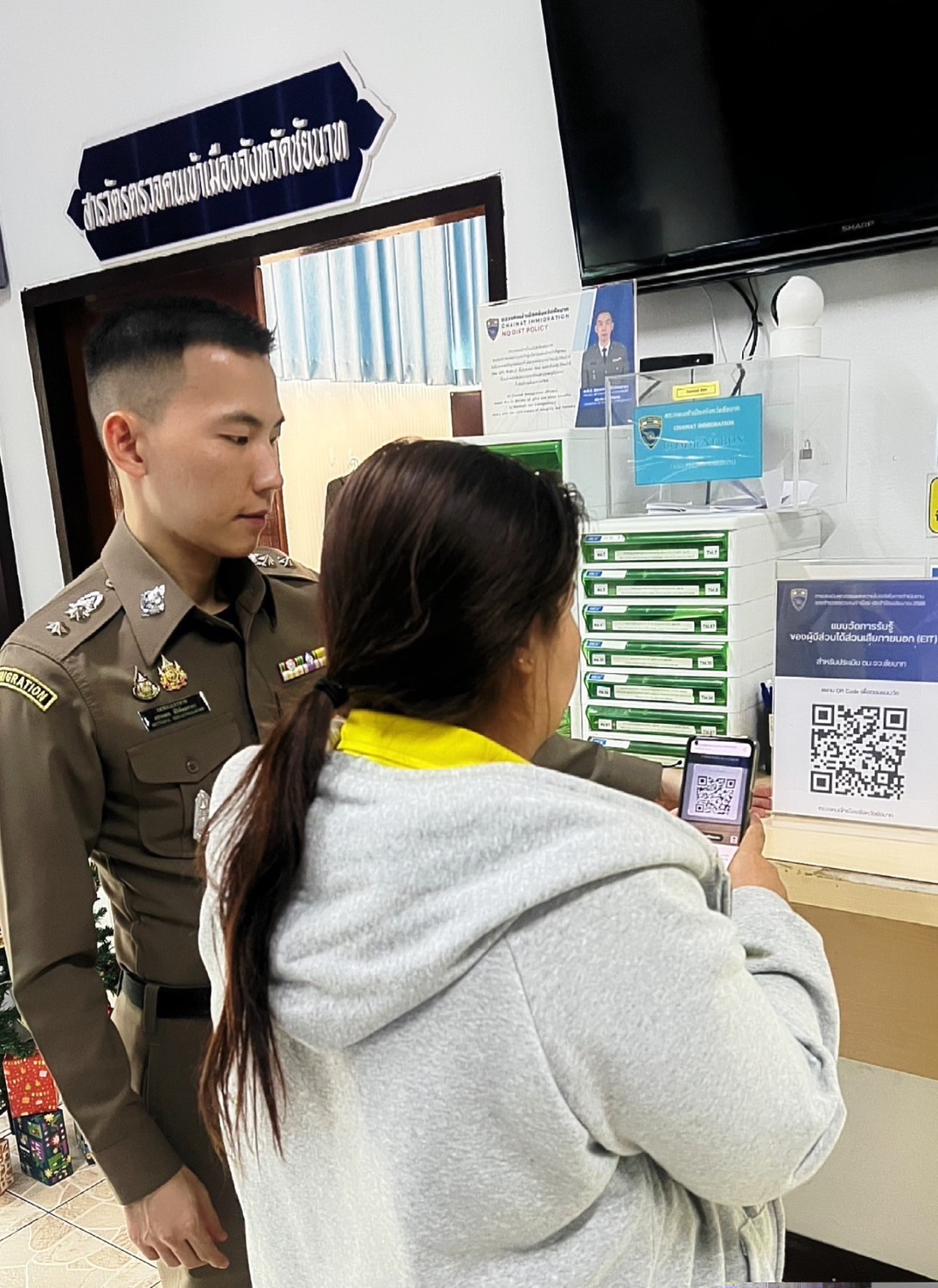 ได้ประชาสัมพันธ์ผู้ที่มารับบริการ ณ ที่ทำการตรวจคนเข้าเมืองจังหวัดชัยนาท เกี่ยวกับการทำแบบประเมินคุณธรรมและความโปร่งใสในการดำเนินงานของหน่วยงาน ในส่วนของผู้มีส่วนได้เสียภายนอก (EIT) ให้ได้รับทราบ