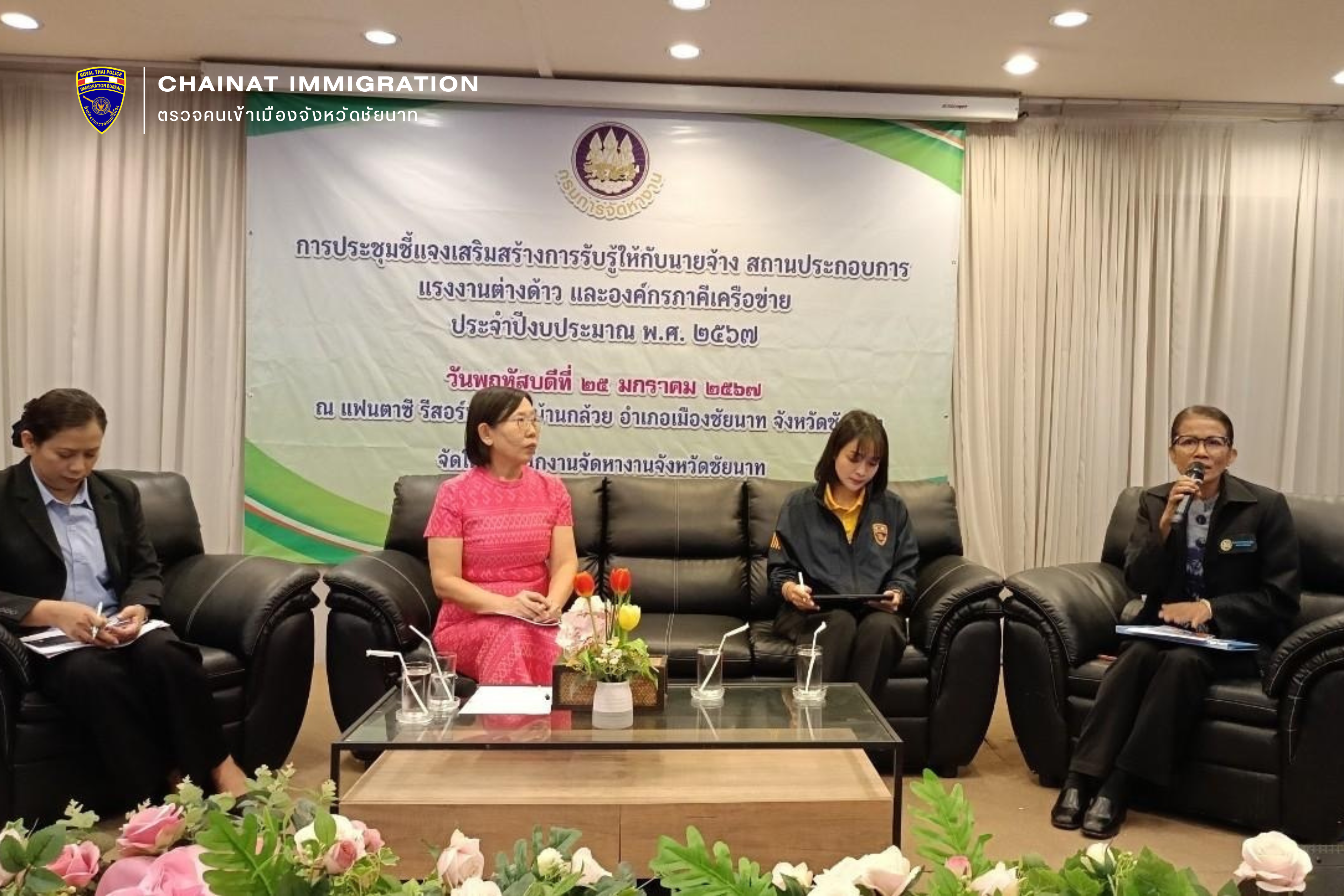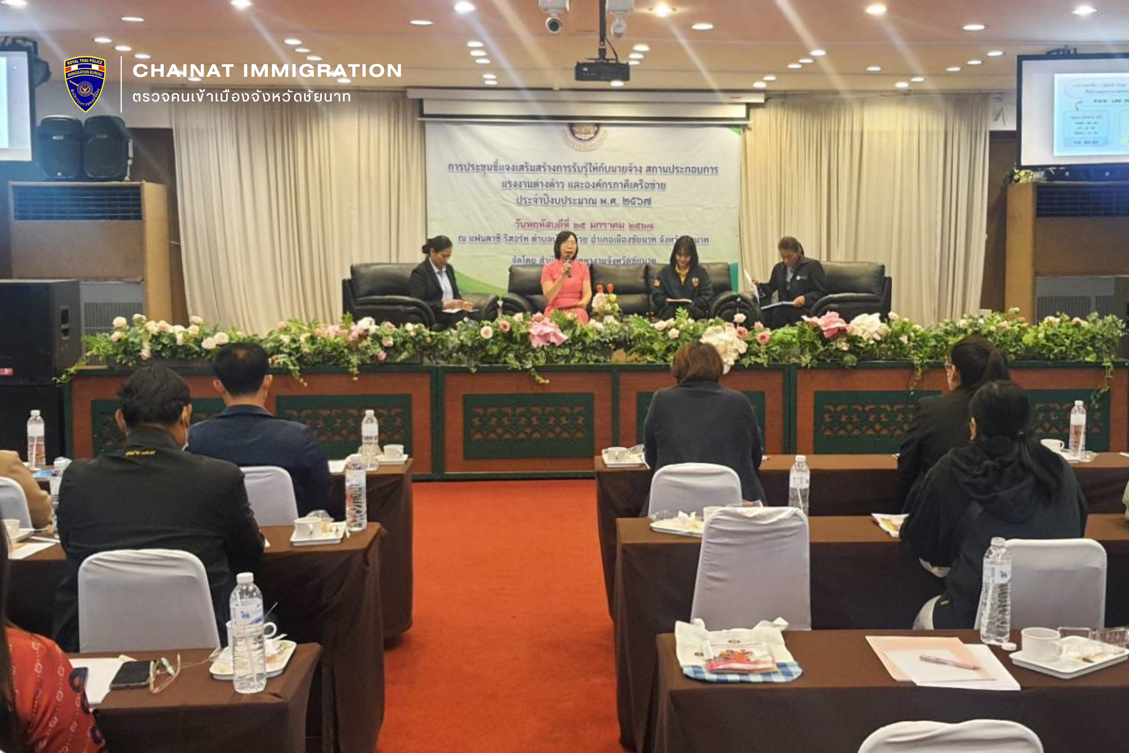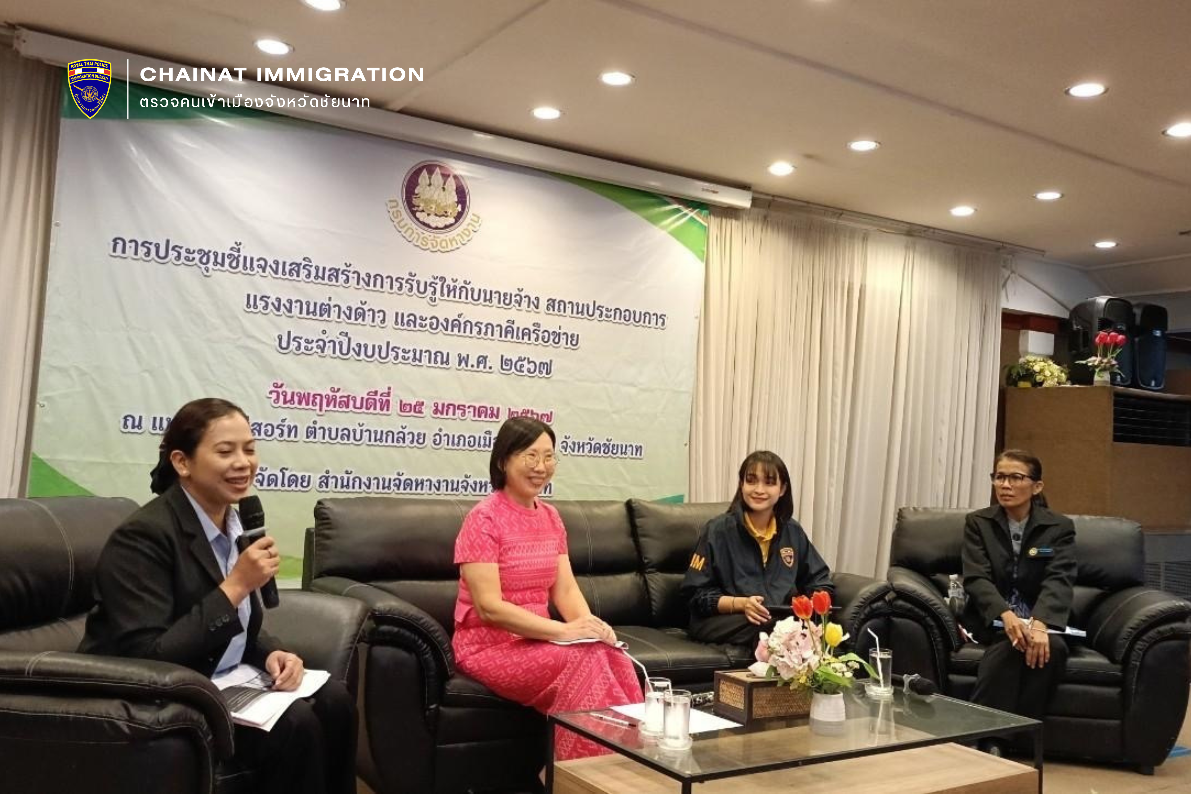 เมื่อวันที่ 25 ม.ค. 2567 เวลาประมาณ 09.00 – 12.00 น. ภายใต้การอำนวยการของ พ.ต.ต.อรรถพล ศิริลัทธยากร สว.ตม.จว.ชัยนาท มอบหมายให้ ร.ต.อ.หญิง ภัทรา โพธิ์ทอง รอง สว.ตม.จว.ชัยนาท เข้าร่วมการประชุมชี้แจงตามโครงการเสริมสร้าง การรับรู้ให้กับนายจ้าง สถานประกอบการ แรงงานต่างด้าว และองค์กรภาคีเครือข่าย โดยเป็นวิทยากรในรูปแบบเสวนาหัวข้อ “การดำเนินการตามกฎหมายตรวจคนเข้าเมือง” เพื่อให้มีความรู้และความเข้าใจตาม พ.ร.ก.การบริหารจัดการการทำงานของคนต่างด้าวฯ รวมถึงระเบียบและขั้นตอนในการขออนุญาตทำงานของแรงงานต่างด้าว ณ แฟนตาซี รีสอร์ท ต.บ้านกล้วย อ.เมือง จ.ชัยนาท