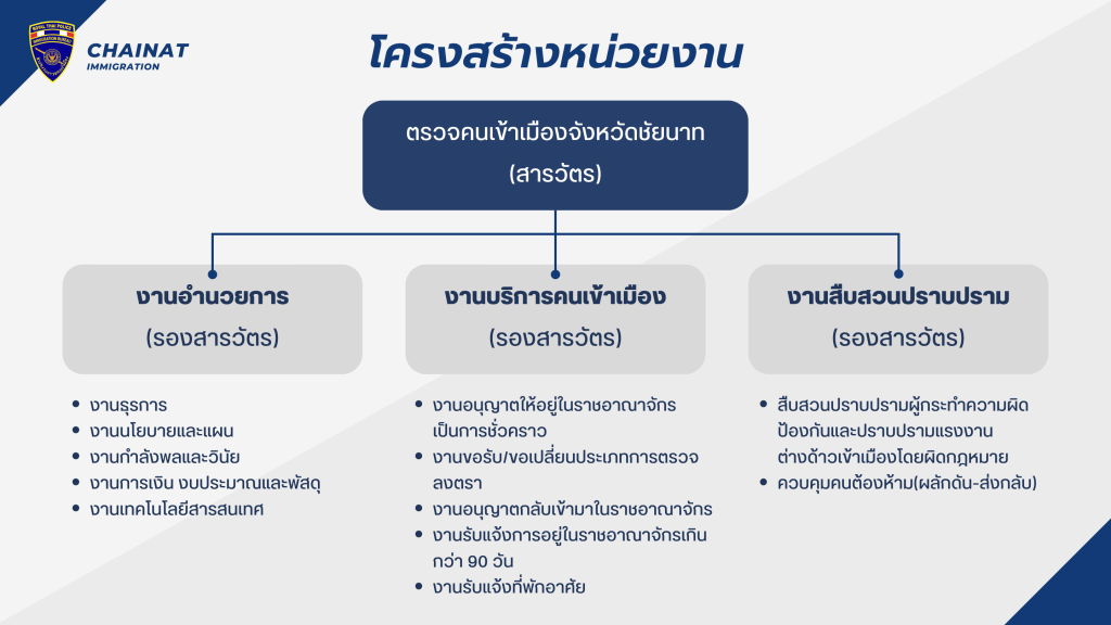 • งานดำเนินการเกี่ยวกับการอนุญาต การระงับ หรือเพิกถอนการอนุญาตเข้ามามีถิ่นที่อยู่ในราชอาณาจักร